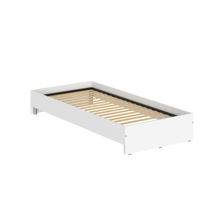 Компактная кровать без изголовья KANN для использования в гостинице или дома, размеры кровати – 940х2040х300 мм, размер спального места - 900х2000, цвет - Белый. Кровать выполнена из ЛДСП, что придает ей прочность и надежность. Конструкция оснащена прочными силовыми креплениями – эксцентриковыми стяжками. Все торцы основных элементов кровати надежно защищены кромкой ПВХ – 2 мм. Регулируемые по высоте опоры обеспечат устойчивость на неровном полу.