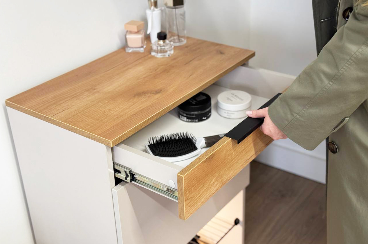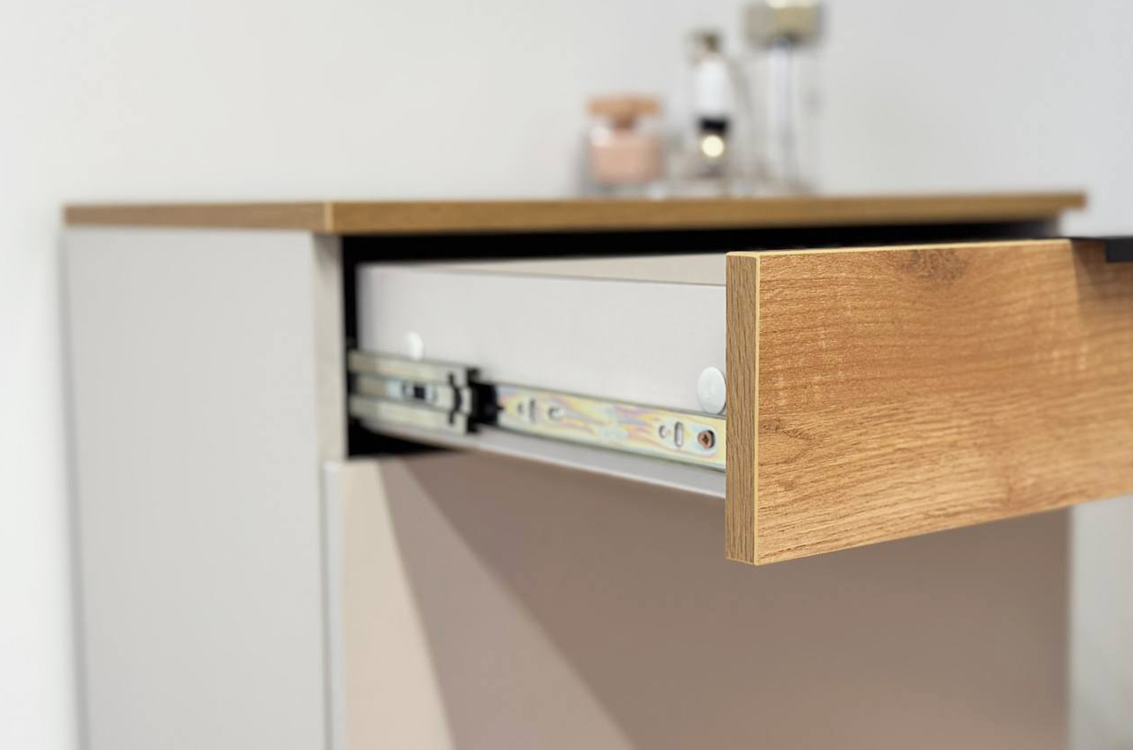Изготовленная из прочного ЛДСП толщиной 16 мм, обувница обеспечивает надежность и долговечность. Выкатной ящик на шариковых направляющих позволяет легко и плавно открывать и закрывать его, предоставляя дополнительное место для хранения мелочей.