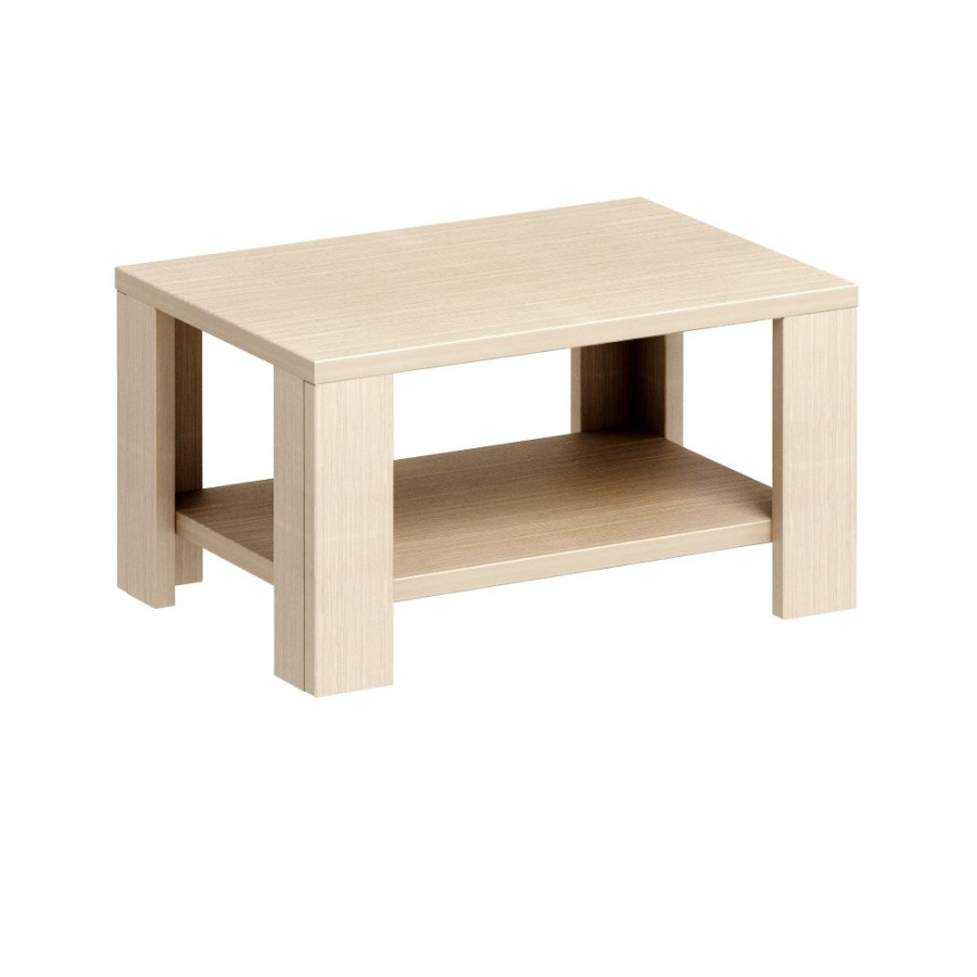 Стол журнальный КР 640 размерами 85х59х46 см (длина, ширина, высота) имеет крышку прямоугольной формы из ЛДСтП «зебрано песочный» толщиной 32 мм, облицованную по периметру кромкой ПВХ толщиной 2 мм в цвет ЛДСтП. Крышка располагается на четырех ногах L-образной формы сечением 12х12 см. Ноги получаются соединением планок из ЛДСтП «зебрано песочный» толщиной 25 мм под прямым углом. Долевые (длинные) стороны планок облицованы кромкой ПВХ толщиной 2 мм в цвет ЛДСтП. На уровне 10 см от пола в столе установлена полка, закрепленная в углах к ногам. Каждая из ног стола имеет в нижнем торце врезную опору, имеющую возможность регулировки по высоте до 1см.